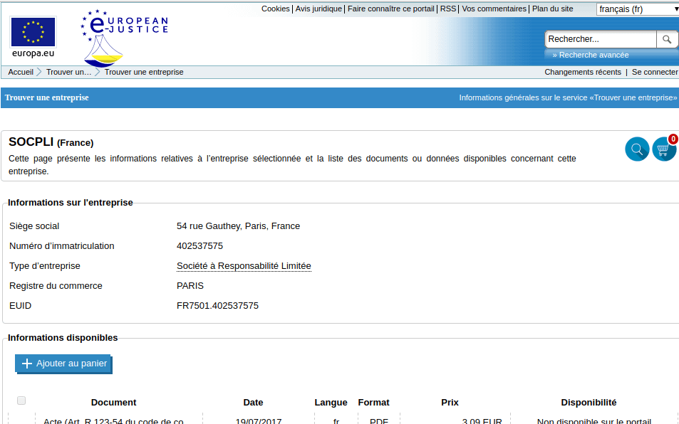 La recherche peut être faite à partir de la dénomination sociale ou du numéro d’immatriculation de l’entreprise. Une fois l'entreprise trouvée, la plate-forme donne quelques informations sommaires sur la société. Ensuite, par l'intermédiaire d'un panier, toute personne qui se connecte peut acquérir des documents complémentaires : statuts, comptes annuels, actes divers.